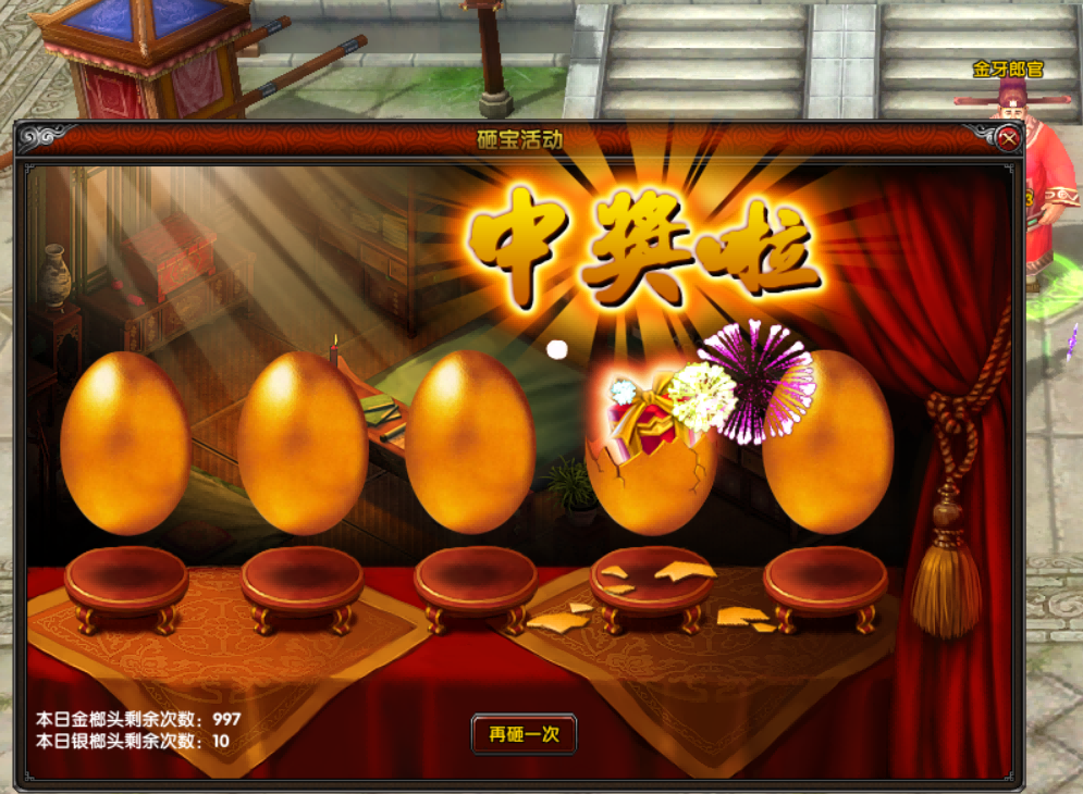 砸宝有金榔头砸宝和银榔头砸宝两种,银榔头每天10次砸宝,金榔头每天1000次砸宝,玩家每天都可以试试手气。