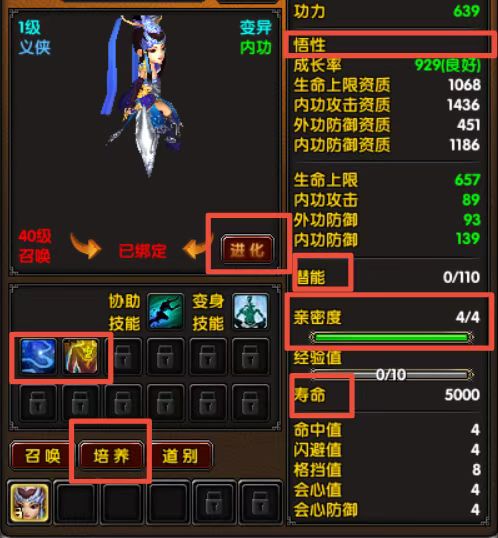 培养界面,可以对游侠提升悟性,增加亲密度,潜能修炼,延长寿命,增加经验值等;