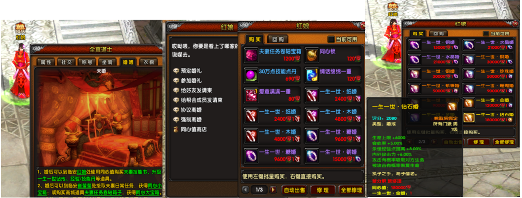 游戏中设有婚姻系统,情投意合的玩家可以结婚举办婚宴,邀请好友参加;结婚后的夫妻,结婚双方同时在线,能增加同心值,可以学习夫妻技能,增加打怪经验和攻击力等;夫妻双方可以学习经验传功和技能点传功技能,每天相互传功;结婚玩家有结婚戒指,有属性加成,逐步提升后,可以提升到极品装备;