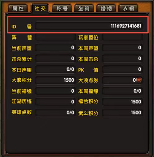 查询方法:在游戏中角色的社交界面,可以看到ID号,如下图: