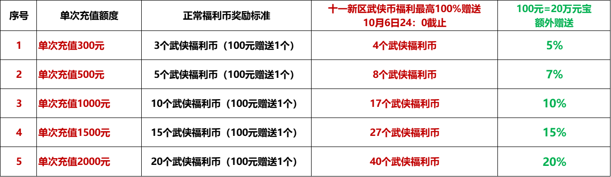 充值福利3:武侠福利币翻倍赠送,最高赠送200%,国庆嗨翻天!