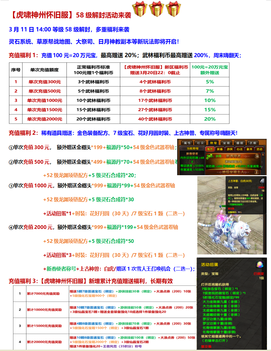 【虎啸神州怀旧服】58级解封,充值福利升级